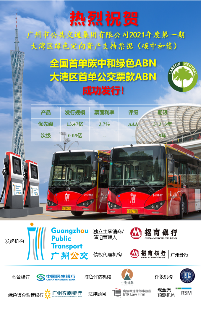 廣州公交集團成功發行“碳中和綠色ABN”,各投資機構踴躍認購,最后以3.7%票面利率超募成功發行,創下2021年以來同類資產證券化產品新低,展現出極佳的示范效應與極高的市場認可度。該項目是貫徹落實黨中央“十四五”規劃中“碳達峰、碳中和”要求的重要舉措,為全國公共綠色出行企業開拓新型的融資方式,更為貫徹落實國家和省、市新能源汽車發展戰略、打贏藍天保衛戰提供資金支持和保障。