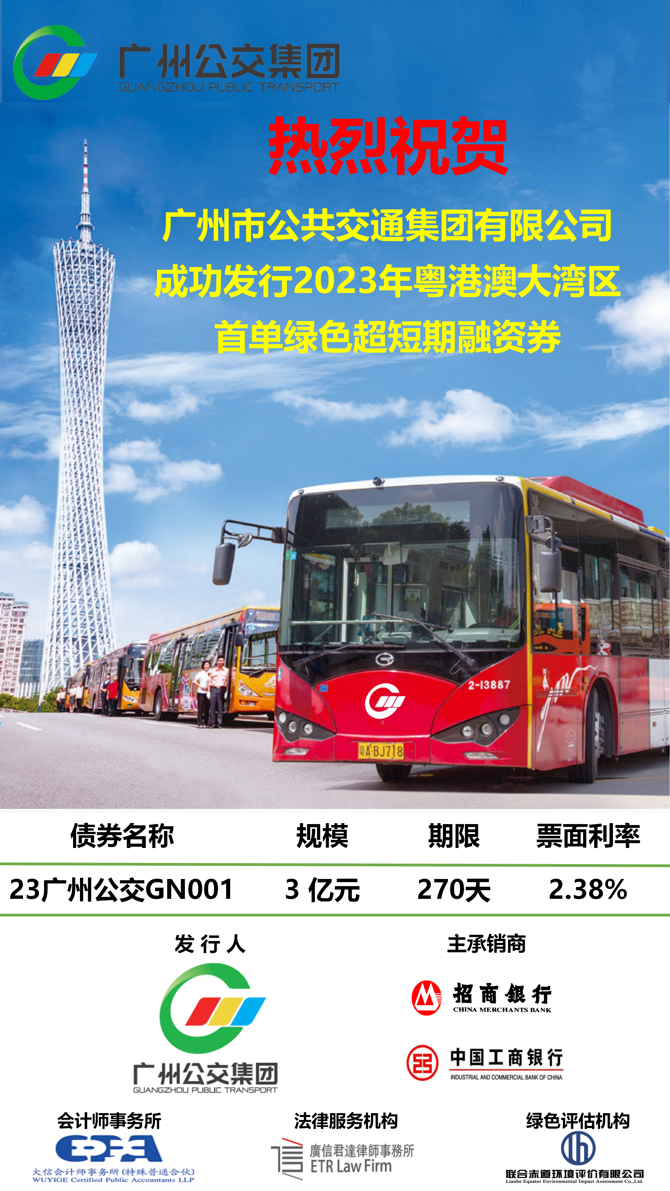 2023年3月14日,在廣州市國(guó)資委、集團(tuán)領(lǐng)導(dǎo)的指導(dǎo)下,廣州市公共交通集團(tuán)有限公司成功發(fā)行2023年粵港澳大灣區(qū)首單綠色超短期融資券,債券簡(jiǎn)稱“23廣州公交GN001”,規(guī)模3億元,期限270天,票面利率2.38%,為近期AAA地方國(guó)企270D綠色超短融最低利率水平。