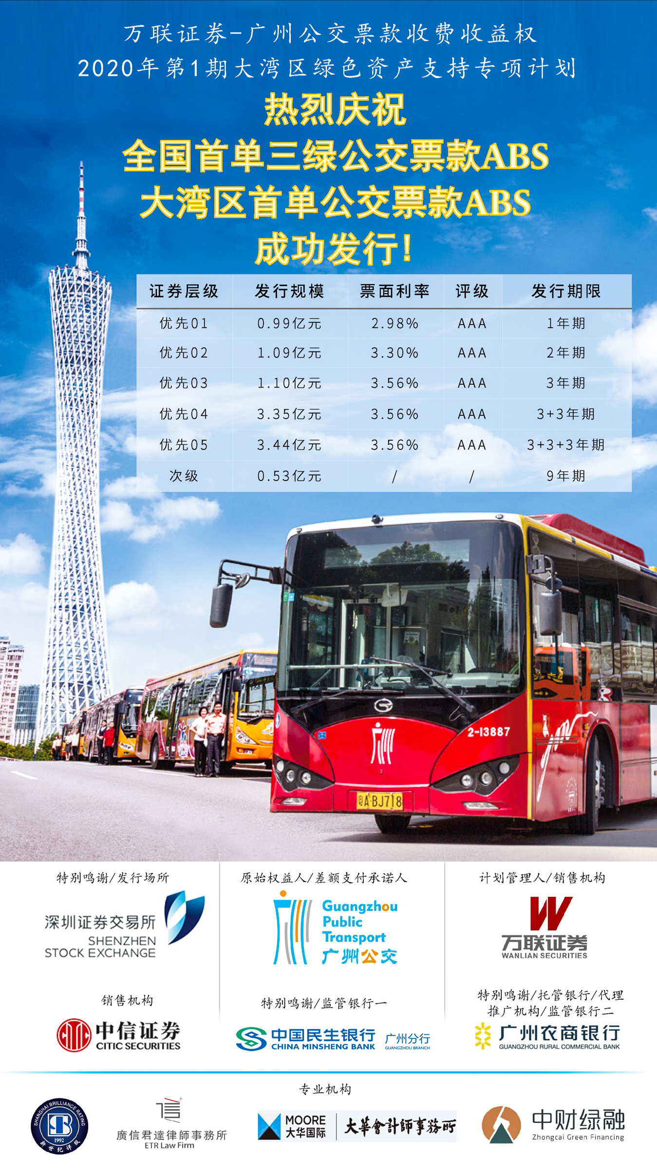 2020年7月30日,在廣州市國資委、深圳證券交易所的大力支持與指導下,廣州市公共交通集團有限公司2020年第1期大灣區綠色資產支持專項計劃10.50億元成功發行。該項目是全國首單三綠公交票款收費收益權ABS,也是粵港澳大灣區首單公交票款收費收益權ABS。