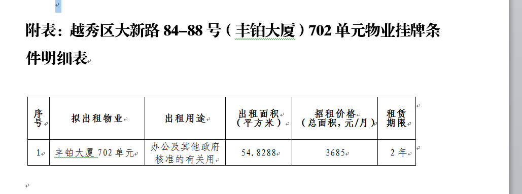 廣州公交集團物業(yè)發(fā)展有限公司就廣州市越秀區(qū)大新路84-88號(豐鉑大廈)702單元物業(yè)進行公開招租,歡迎符合資格的意向方參加競租,招租相關(guān)事宜公告如下: