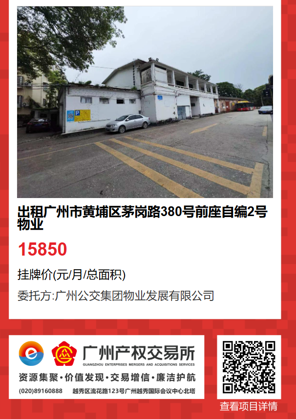 現有廣州市黃埔區茅崗路380號前座自編2號物業出租項目。該項目在廣州產權交易所網站掛牌公開招租,歡迎有意向的企業法人或自然人(含個體工商戶)參加應租。現將有關事項說明如下: