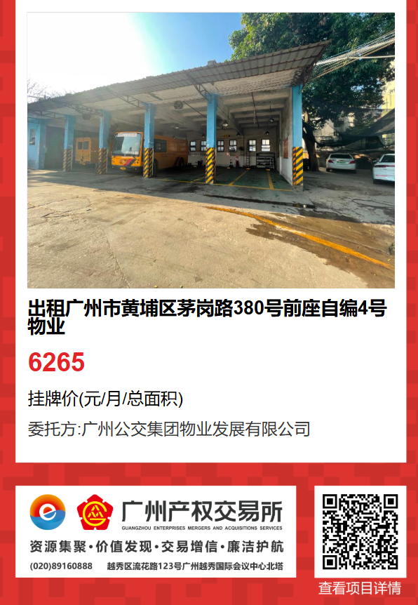 現(xiàn)有廣州市黃埔區(qū)茅崗路380號(hào)前座自編4號(hào)物業(yè)出租項(xiàng)目。該項(xiàng)目在廣州產(chǎn)權(quán)交易所網(wǎng)站掛牌公開招租,歡迎有意向的企業(yè)法人或自然人(含個(gè)體工商戶)參加應(yīng)租。現(xiàn)將有關(guān)事項(xiàng)說明如下: