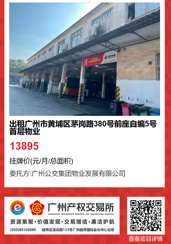 現有廣州市黃埔區茅崗路380號前座自編5號首層物業出租項目。該項目在廣州產權交易所網站掛牌公開招租,歡迎有意向的企業法人或自然人(含個體工商戶)參加應租。現將有關事項說明如下: