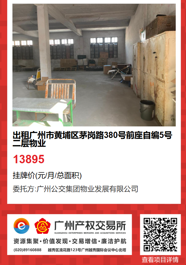 現有廣州市黃埔區茅崗路380號前座自編5號二層物業出租項目。該項目在廣州產權交易所網站掛牌公開招租,歡迎有意向的企業法人或自然人(含個體工商戶)參加應租。現將有關事項說明如下:
